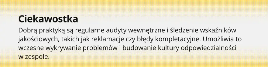 Oprócz zabezpieczeń prawnych i ubezpieczeniowych warto wdrożyć procedury organizacyjne, które zmniejszają ryzyko błędu lub zaniedbania. Należy do nich m.in. podwójna weryfikacja stanów przy przyjęciu towaru, kontrola dokumentów przewozowych, oznaczanie partii i terminów ważności, czy monitoring operacji przy pomocy systemu WMS. Istotna jest również edukacja zespołu – zwłaszcza w zakresie odpowiedzialności za błędy operacyjne i dokumentacyjne. Dobrą praktyką jest prowadzenie regularnych audytów wewnętrznych, testów zgodności stanów oraz śledzenie wskaźników jakościowych (np. liczby reklamacji, odchyleń inwentaryzacyjnych, błędów kompletacyjnych). Pozwala to nie tylko wykrywać problemy na wczesnym etapie, ale także budować kulturę odpowiedzialności w zespole.