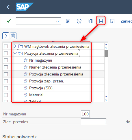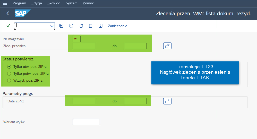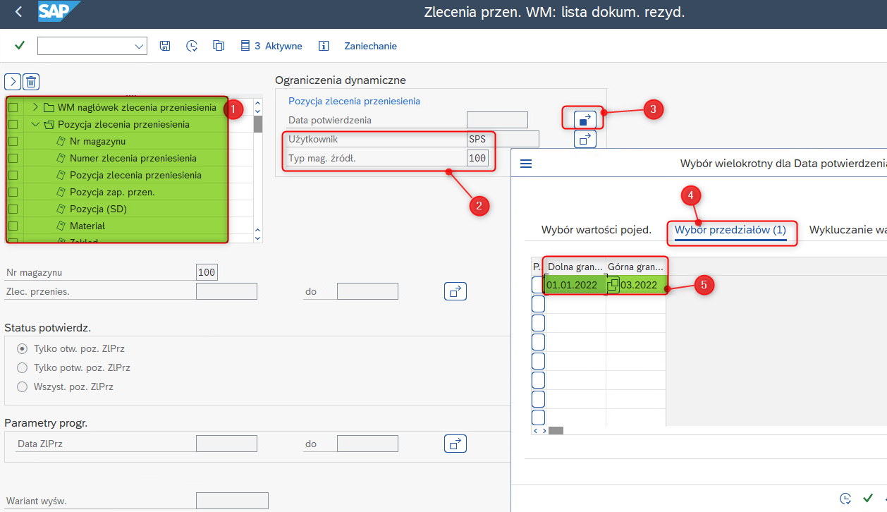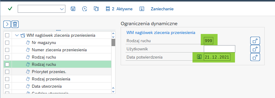 Mamy tutaj zatem do wyboru tylko numer magazynu lub sam numer zlecenia przeniesienia oraz jego status i datę utworzenia. Co zrobić w sytuacji gdybyśmy chcieli wyświetlić dane na podstawie daty potwierdzenia (zamiast utworzenia) i do tego jeszcze zawęzić zakres wyszukiwania o te pozycje zlecenia przeniesienia, które pobierane były z konkretnego typu magazynu lub miejsca (lub przez wybranego użytkownika)? Dane źródłowych i docelowych typów magazynu oraz nazwy użytkowników potwierdzających, są przechowywane w pozycji dokumentu (w odrębnej tabeli LTAK). Nie wyselekcjonujemy takich danych z samego nagłówka dokumentu. Aby to zrobić potrzebujemy właśnie ograniczeń dynamicznych. Sprawdźmy zatem co uzyskamy przez ich rozwinięcie.