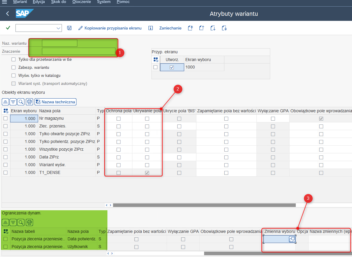 W dolnej sekcji atrybutów wariantu znajdziemy pola, które wybraliśmy jako „ograniczenia dynamiczne”. Bardzo przydatna może okazać się opcja dynamicznej kalkulacji daty (3). Jeśli zapiszemy zakres dat, np. od stycznia do marca, to taki zakres dat otrzymamy również, jeśli uruchomimy raport w drugiej części roku. Może to się okazać uciążliwe. Byłoby super jakby system automatycznie podstawiał daty na 3 miesiące do tyłu od daty aktualnej.