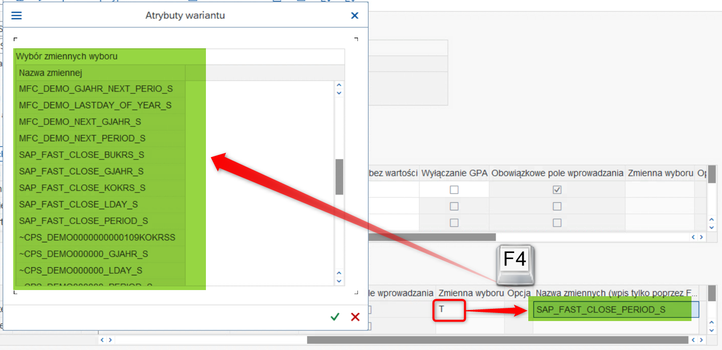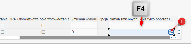 Następnie przesunąć ekran w prawo i kliknąć w symbol kwadratu lub po postawieniu kursora na polu „nazwa zmiennych” wcisnąć klawisz F4: