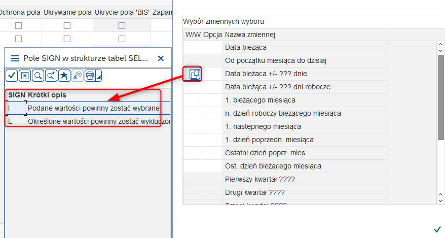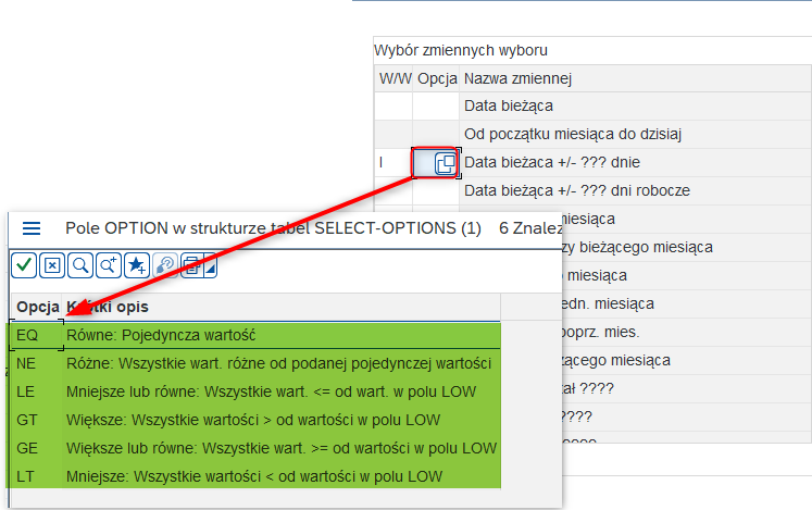 Rys. 20. Pole OPTION w strukturze tabel SELECT-OPTIONS – wybór opcji.