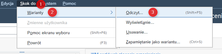Po zapisaniu wariantu, zgodnie z poprzednimi punktami, będziemy w stanie w każdej chwili ekspresowo wygenerować raport, który dynamicznie wybierze datę na 90 dni do tyłu od aktualnej. Wystarczy z poziomu paska menu transakcji wybrać: skok do->warianty->odczyt lub wcisnąć skrót Shift+F5 .