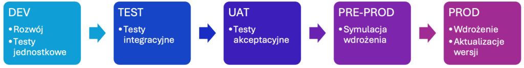 DEV służy szybkim iteracjom, bywa niestabilny i często operuje na uproszczonych danych. UAT/Test przeciwnie: musi zachowywać wysoki poziom stabilności, pełne integracje i jak najwierniejsze kopie danych produkcyjnych. Nie mieszamy tych ról - akceptacja biznesowa odbywa się w środowisku stabilnym, nie w miejscu aktywnego rozwoju.