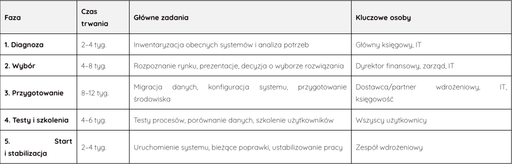 Tabela. Etapy wdrożenia systemu finansowo-księgowego – plan krok po kroku